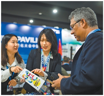 《联合国气候变化框架公约》第二十九次缔约方大会期间,工作人员向参加“生态文明与美丽中国实践”主题边会的嘉宾介绍情况。新华社记者 孟 菁摄